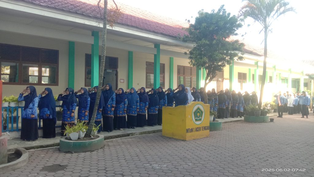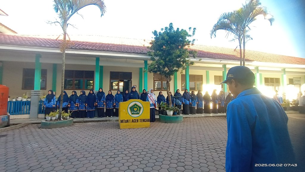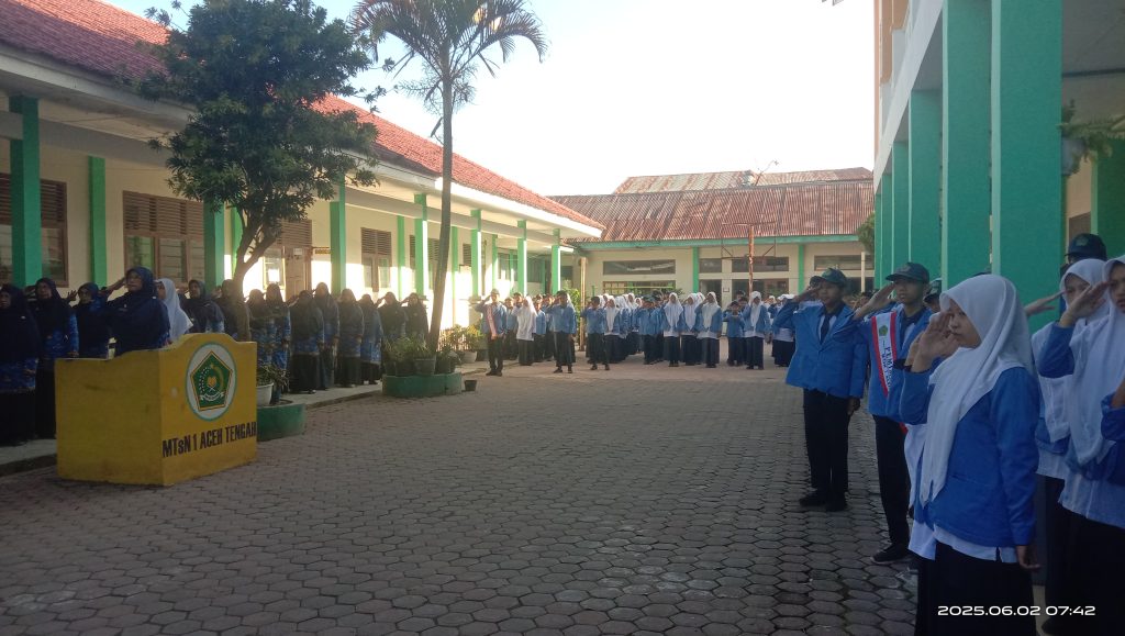 Aceh Tengah – (02/06/25). Dalam rangka memperingati Hari Lahir Pancasila yang jatuh pada 1 Juni 2025, MTsN 1 Aceh Tengah melaksanakan upacara bendera di lapangan Madrasah pada Senin pagi ini. Upacara berlangsung dengan khidmat dan diikuti oleh seluruh dewan guru, staf tata usaha, serta siswa-siswi MTsN 1 Aceh Tengah.